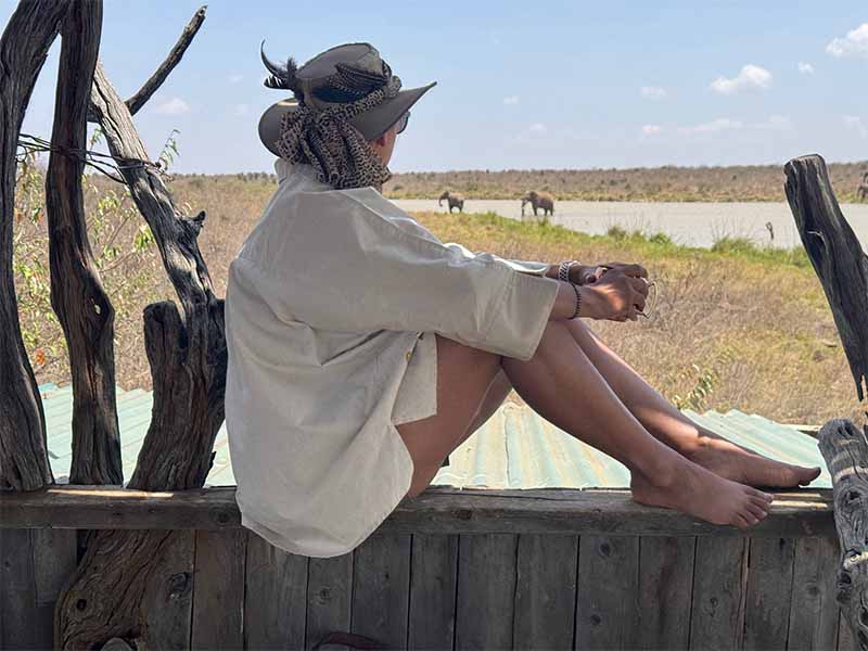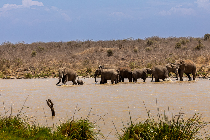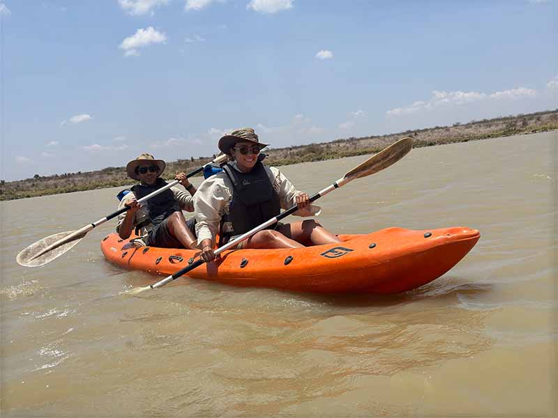 The experience of being on the water changes the proportions of the place entirely. From a game drive vehicle you have height, and glass, and the insulation of an engine; the animals exist at a comfortable remove, framed and manageable. A kayak offers none of that. You’re sitting at water level, paddle across your knees, with nothing between you and the sounds of the conservancy — the birds in the reeds close enough to hear individually, the water making small sounds against the hull. We’d been out for a while when the elephants started coming down to drink. They came in from both sides of the dam, moving through the bush at the edges and then out into the open, a few at first and then more — large cows, younger animals, a calf that pushed past two adults to reach the water first and then stood there with its trunk submerged, apparently satisfied. From the kayak, their footfalls in the shallows carried across the water clearly. The sound of them drinking was close enough to feel less like observation and more like company.