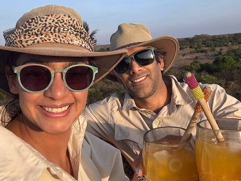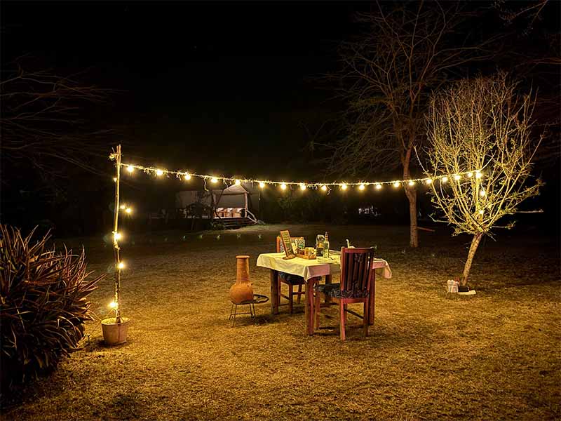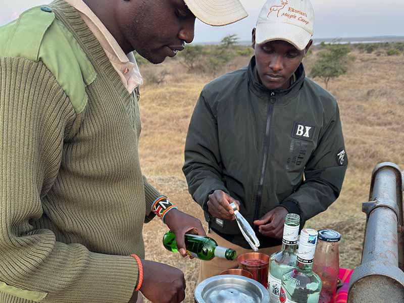 We came back to the dam for sundowners as the sun dropped behind the hills. The light at that hour in Laikipia goes quickly — one moment the water is bright and flat, then it shifts to copper, and then the colour deepens into something closer to amber, the surface of the dam holding the warmth of it long after the sky had moved on. Birds were settling into the reed beds. The air had cooled at the edges. Then dinner at camp, lit by lanterns, with the sounds of the bush arriving from different distances as the night settled in around us.