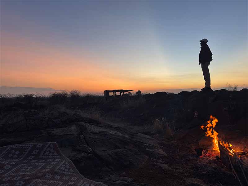 In the evening, we walked out to a rocky outcrop for sundowners — a short walk from camp, but enough elevation to open the plains in every direction. The light was going fast by the time we got there, the sky cooling from orange through to a deep, bruised violet over the hills to the west. It’s the kind of spot that makes you understand why Laikipia holds the light the way it does — the land is high enough, and flat enough, and wide enough that the sky above it feels proportionate to the space below. Dinner was back at camp, under a clear sky heavy with stars, the lanterns lit along the path and the night air carrying the sounds of whatever was moving through the conservancy beyond the camp’s perimeter.